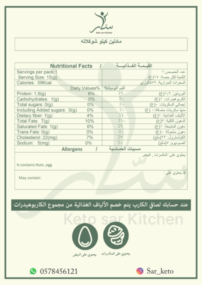 - المكونات: دقيق لوز – بيض – زبدة – محلي اريثرتول ،زيليتول،ستيفيا) نكهة كراميل صناعية.